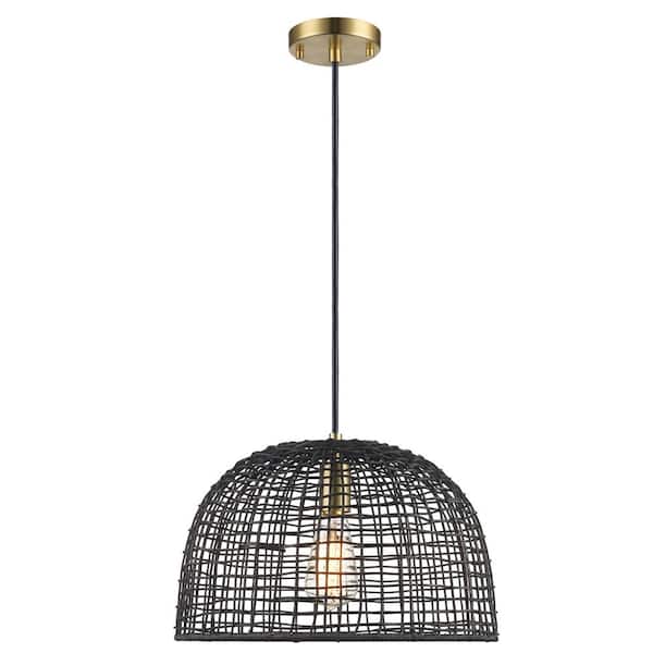 1-Light Black and Gold Pendant Light Fixture with Natural Woven Basket Shade