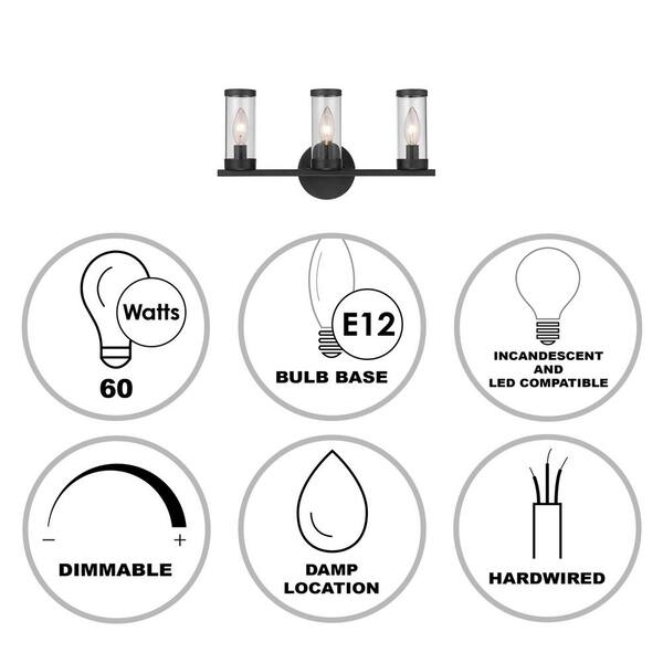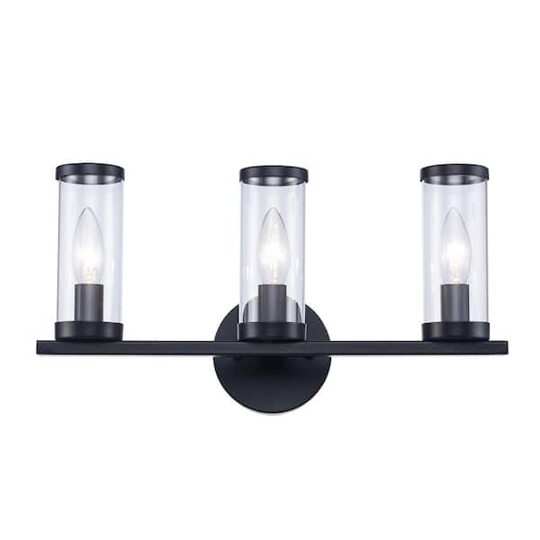 16.5 in. 3-Light Black Bathroom Vanity Light Fixture with Clear Glass Shade and Metal Accents