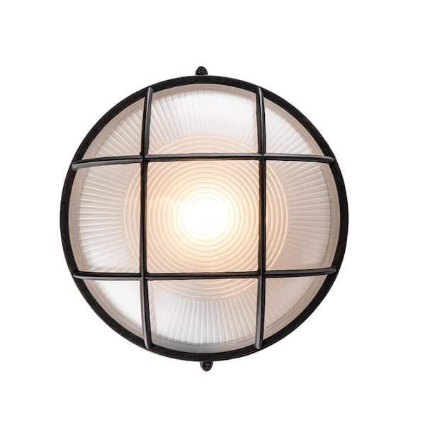 Aria 8 in. 1-Light Rust Round Bulkhead Outdoor Wall Light Fixture with Frosted Glass