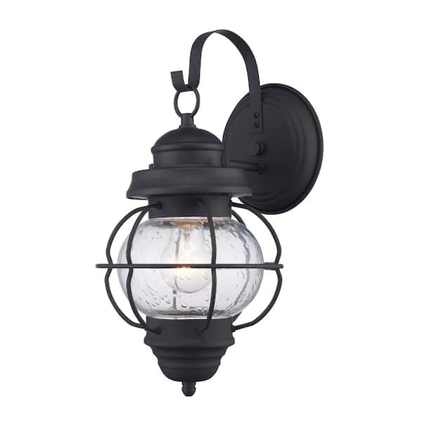 Catalina 13.5 in. 1-Light Black Outdoor Wall Light Fixture with Seeded Glass