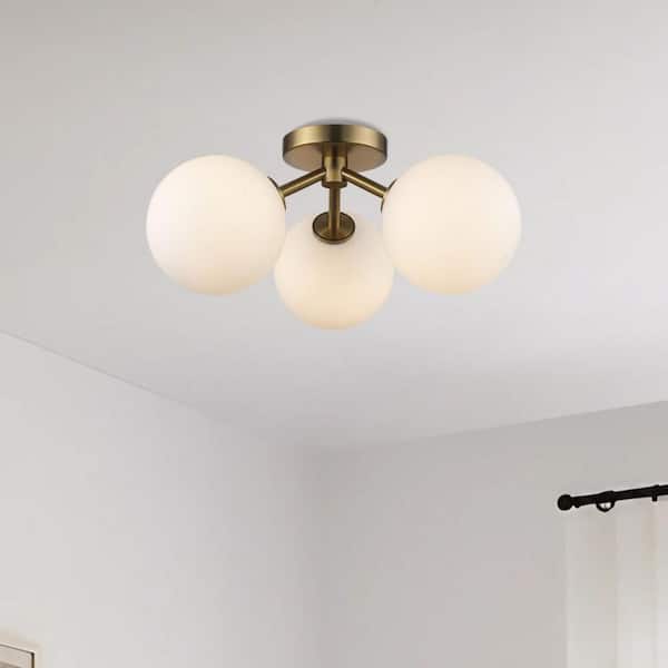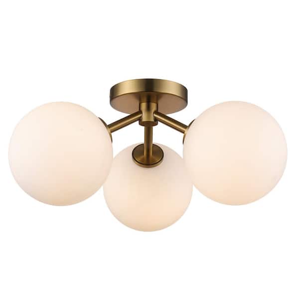 Haskell 16 in. 3-Light Antique Gold Flush Mount Ceiling Light Fixture with White Opal Glass Shades