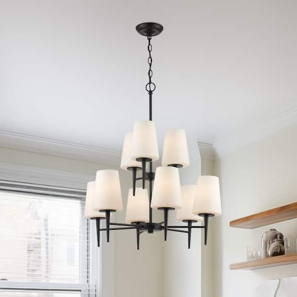 Horizon 9-Light Black Hanging Tiered Chandelier Light Fixture with Frosted Glass Shades