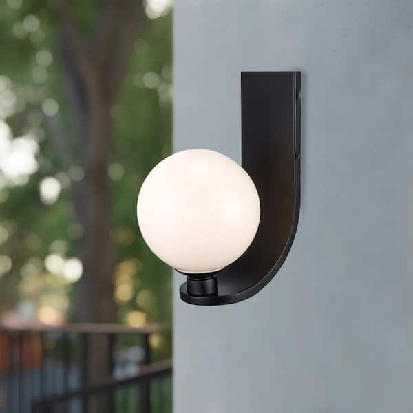 Lane 14 in. 1-Light Black Outdoor Wall Light Fixture with White Opal Glass Globe Shade
