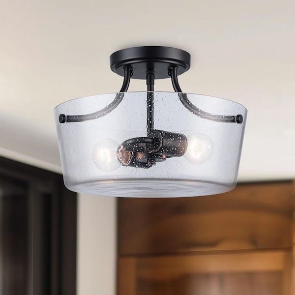 Simi 13 in. 2-Light Black Semi-Flush Mount Ceiling Light with Clear Seeded Glass Shade