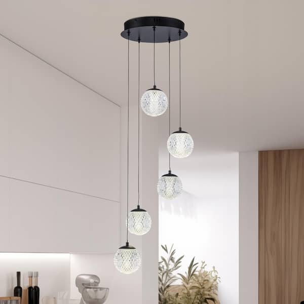 Sunburst 5-Light Black Integrated LED Hanging Chandelier Light Fixture with Acrylic Globe Shades