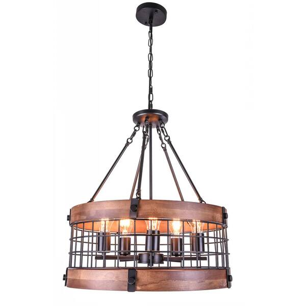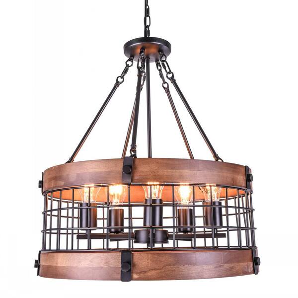 5-Light Vintage Industrial Brown Chandelier with Wooden Pendant Light