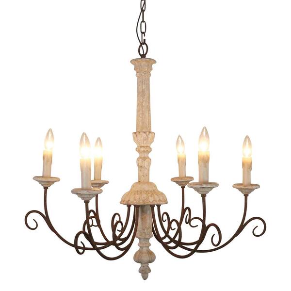 6-Light Retro White Wood Chandelier Farmhouse Candle-Style Pendant Light