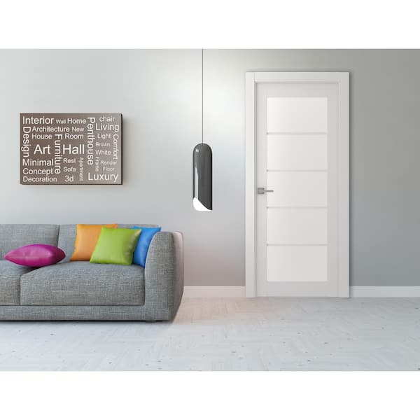 24 in. x 80 in. Smart Pro Polar White Left-Hand Solid Core Wood 5-Lite Frosted Glass Single Prehung Interior Door