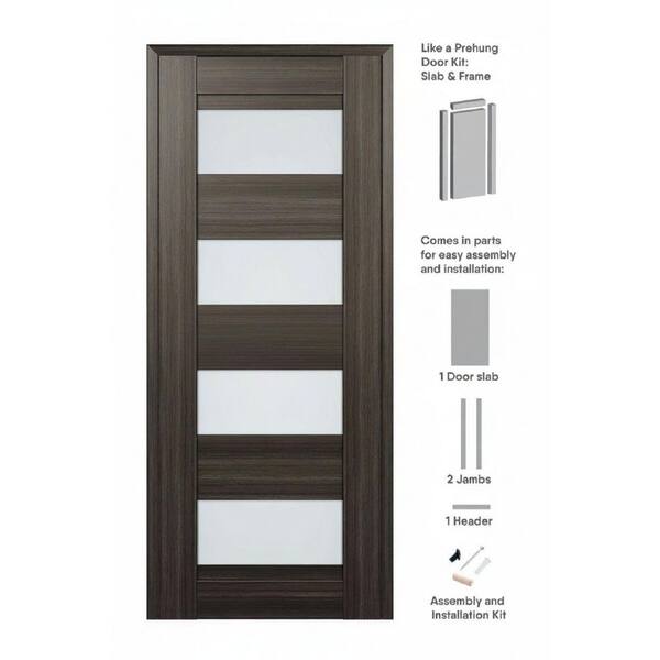 Della 24 in. x 80 in. Left-Hand Frosted Glass Solid Core 4-Lite Gray Oak Wood Composite Single Prehung Interior Door