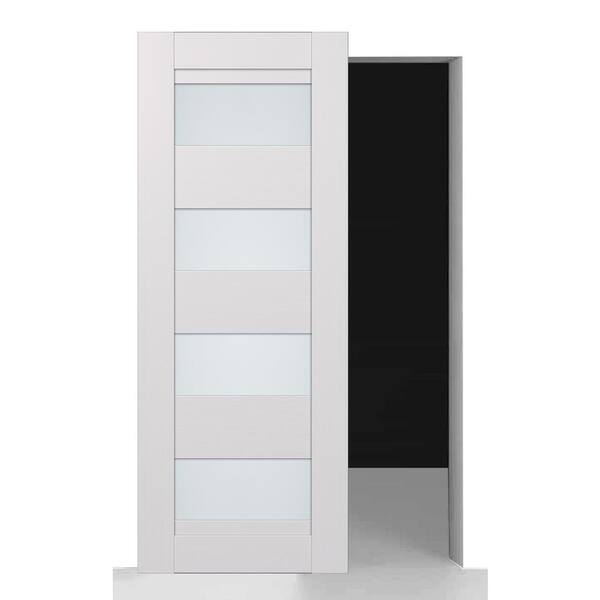 Della 28 in. x 84 in. Bianco Noble 4 Lite Frosted Glass w/BaseBoard Wood Hidden Sliding Barn Door with Hardware Kit
