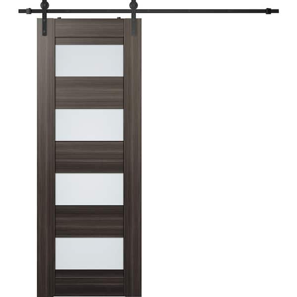 Della 28 in. x 95.25 in. 4-Lite Frosted Glass Gray Oak Finished Composite Interior Sliding Barn Door with Hardware Kit