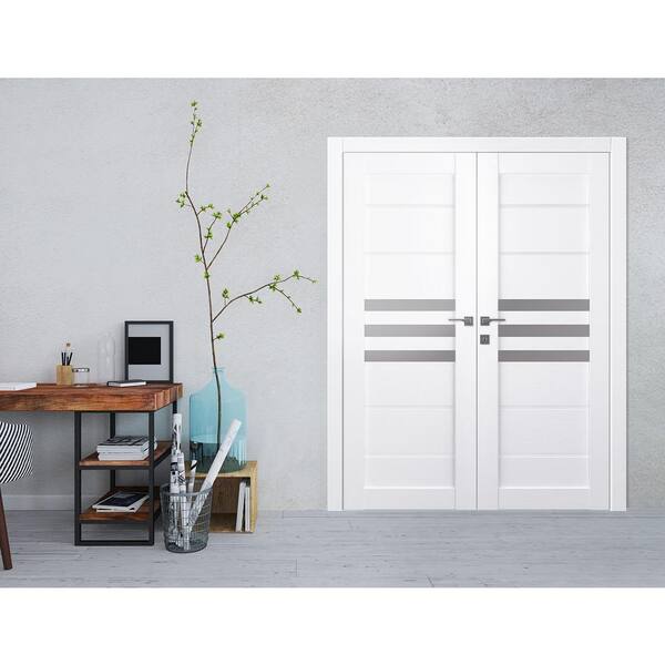 Dome 56 in. x 84 in. Both Active Frosted Glass 3-Lite Bianco Noble Wood Composite Double Prehung Interior Door