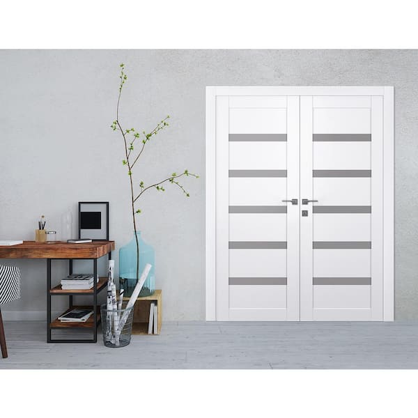 Leora 36 in. x 95,25 in. Both Active 5-Lite Frosted Glass Snow White Wood Composite Double Prehung Interior Door