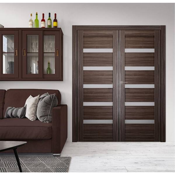 Leora 64 in. x 80 in. Both Active 5-Lite Frosted Glass Gray Oak Wood Composite Double Prehung French Door