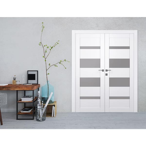 Mirella 48 in. x 80 in. Both Active 4-Lite Frosted Glass Snow White Wood Composite Double Prehung Interior Door