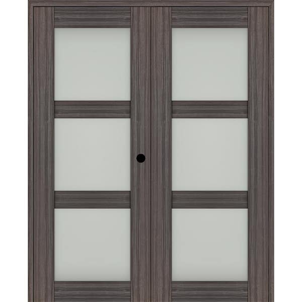 Paola 60 in. x 84 in. Left Hand Active 3-Lite Frosted Glass Gray Oak Wood Composite Double Prehung French Door