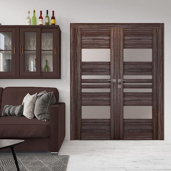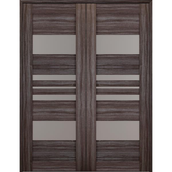 Romi 60 in. x 80 in. Both Active 5-Lite Frosted Glass Gray Oak Finished Wood Composite Double Prehung French Door