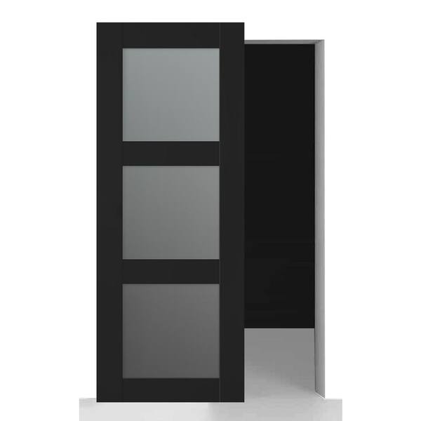 Vona 3Lite 24 in. x 96 in. Frosted Glass Black Matte Wood w/o BaseBoard Hidden Sliding Barn Door with Hardware Kit