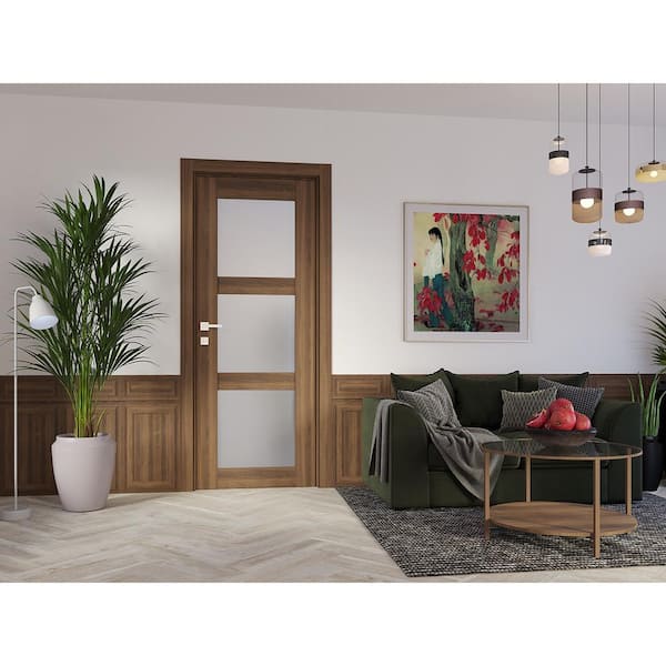 Vona 3Lite 32 in. x 80 in. No Bore 3-Lite Frosted Glass Pecan Nutwood Composite Wood Interior Door Slab