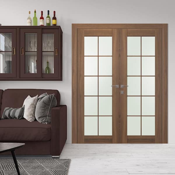 Vona 64 in. x 80 in. 10-Lite Left Hand Active Frosted Glass Pecan Nutwood Wood Composite Double Prehung French Door