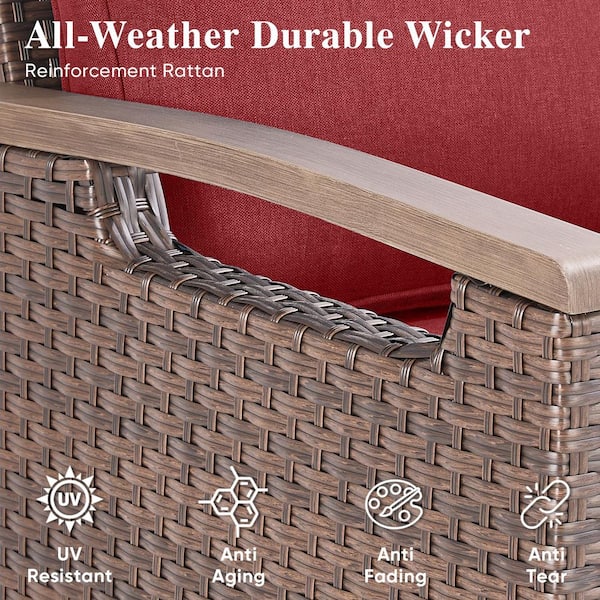Concave 2-Person Brown Wicker Outdoor Glider Patio Swivel Rocking Chair Set with Red Cushions