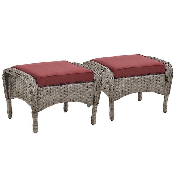 Rotavia 2-Piece Gray PE Wicker Steel Frame Outdoor Ottoman with Olefin Red Cushions, Multipurpose Patio Footstools