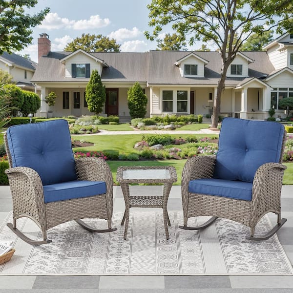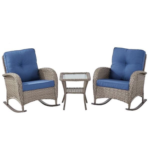 Rotavia 3-Piece Gray PE Wicker Outdoor Rocking Chair with Olefin Blue Cushions Patio Conversation Set and Side Table