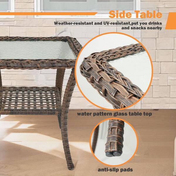Rotavia 5-Piece Brown Wicker Patio Conversation Set with Gray Cushion and Retangular 50000 BTU Gas Fire Pit Table