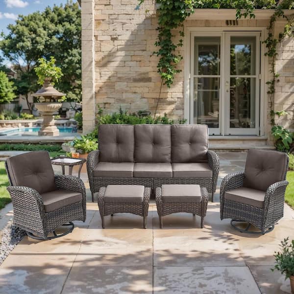 Rotavia Brown 6-Piece Wicker Patio Conversation Set with Swivel Rockers, Outdoor Sofa Seating Set with Gray Cushions