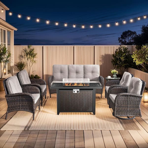 Rotavia Brown PE Wicker 7-Piece Outdoor Rectangular Fire Pit Table Patio Conversation Sofa Set with Beige Cushions