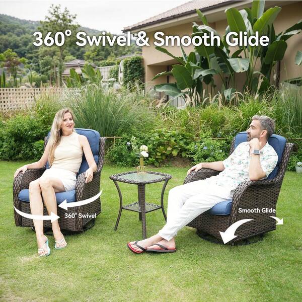 Smiley 4-Piece Brown Wicker Outdoor Swivel Glider Patio Rocking Chair with Olefin 5 in. Thick Blue Cushion