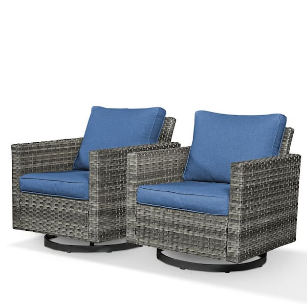 UvaNest 2-Piece Gray Wicker Outdoor Swivel Glider Rocking Chair with Blue Cushion and Deep Seating Set