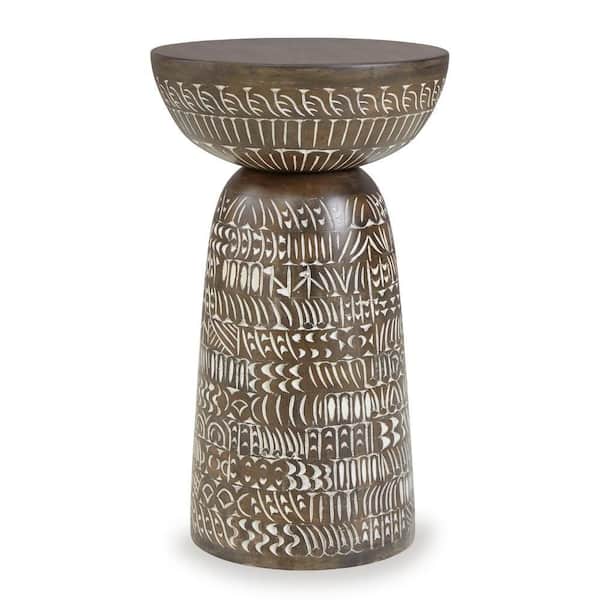 17 in. Brown and Cream Round Wooden End Table with Classical Tribal Carved Design