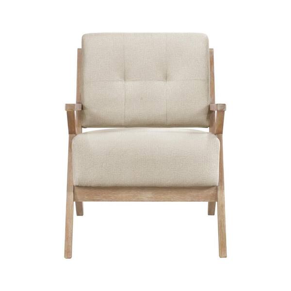 Beige and Brown Polyester Armchair with Wooden Frame and Cushioned Seat
