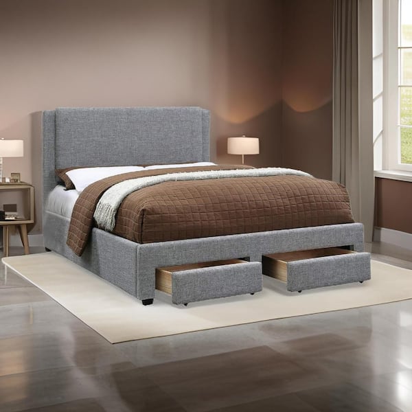 Bovi Gray Wood Frame King Size Platform Bed with 2 Storage Drawers