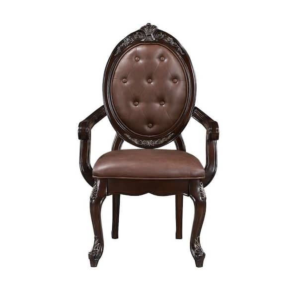 Brown Vegan Faux Leather Carved Details Dining Armchair