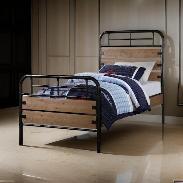 Brown and Black Wooden Frame Twin Platform Bed with Slated Headboard