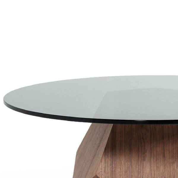 Cid 35 in. Walnut Round Glass Coffee Table with Geometric Block Pedestal Base