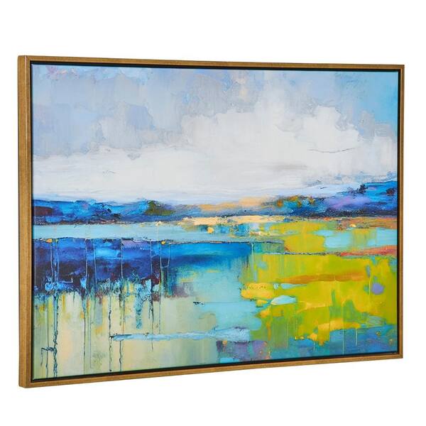 Gold, Blue and Yellow Wooden Framed Handcrafted Canvas Wall Art Sunset Calm Water