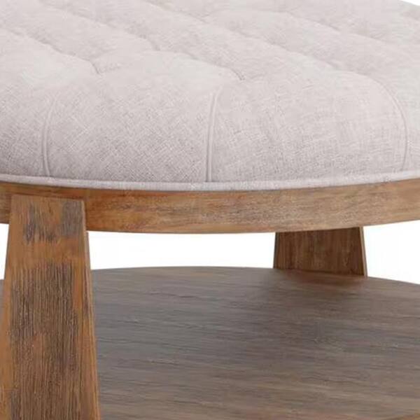 Gus 40.75 in. Brown and Beige Round Wood Coffee Table with Button Tufted Beige Fabric