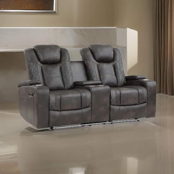Mia Brown Gray Faux Leather Glider Power Double Recliner Loveseat with USB Port