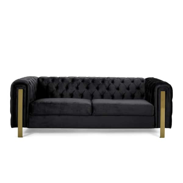 Nua 34.5 in. Rolled Arm Velvet Rectangle Chesterfield Button Tufted Sofa in. Black and Gold