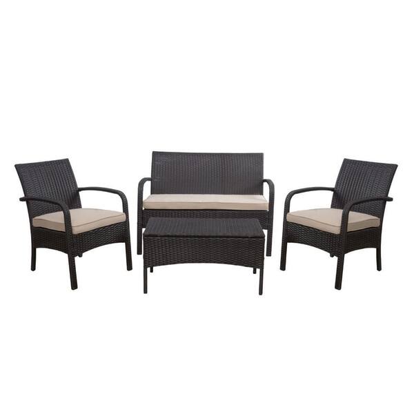 Orry Brown 4-Piece Metal and Wicker Patio Conversation Set with Tan Cushion