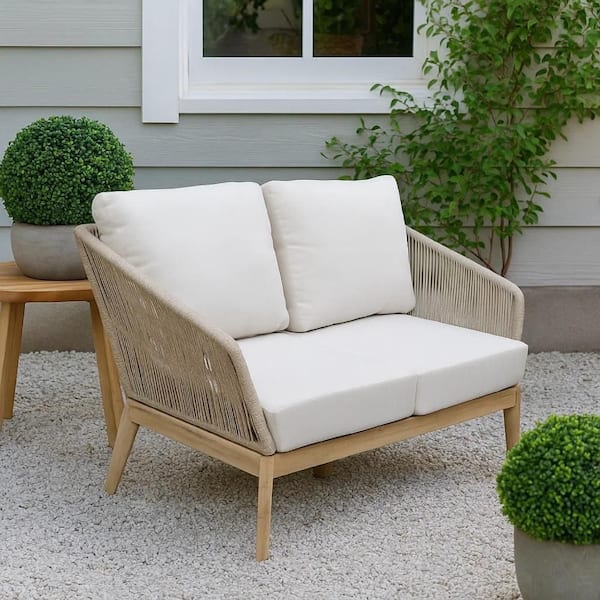 Rich Brown Acacia Wood Fade Resistant Cushions Outdoor Loveseat Sofa with Brown and Beige Cushions