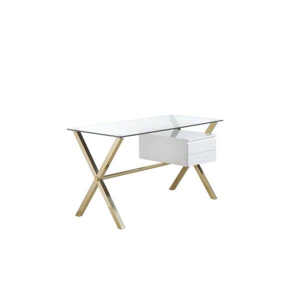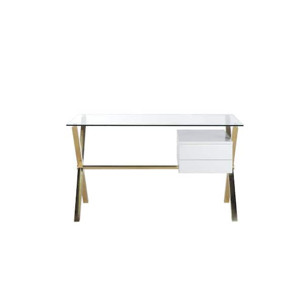 Tia 25 in. Rectangular White and Gold Glass Top 2-Drawer Writing Desk