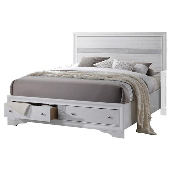 White Wooden Frame King Platform Bed with Panel Headboard