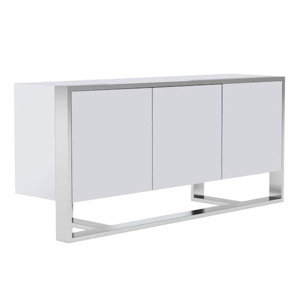 White and Chrome Wood Top 17.5 in. Sideboard with 3-Doors and 3 Shelves