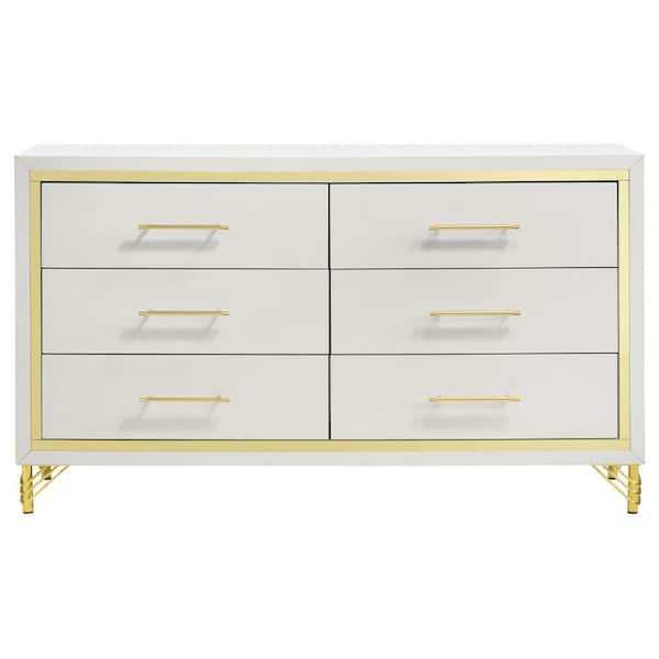 White and Gold 6 Drawer 58.5 in. Dresser Without Mirror