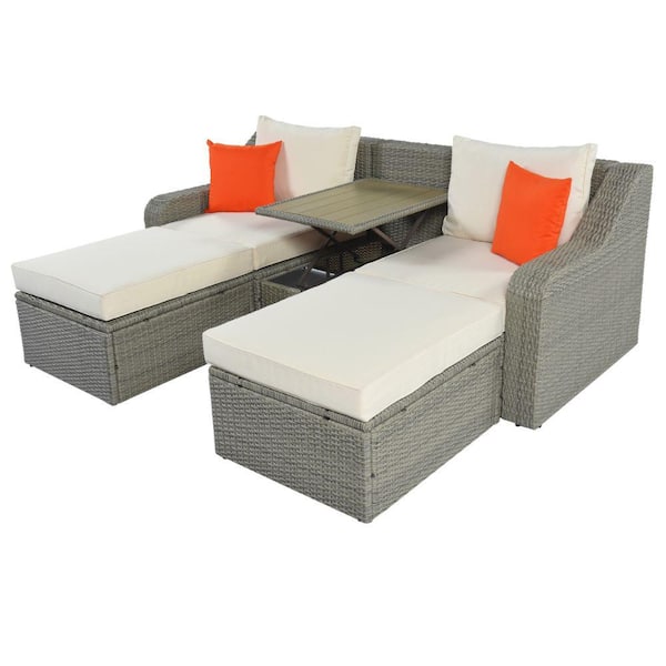 White and Gray 3-Piece All Weather Wicker Outdoor Sectional Sofa Lounger with Cushions and Built in Table