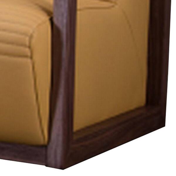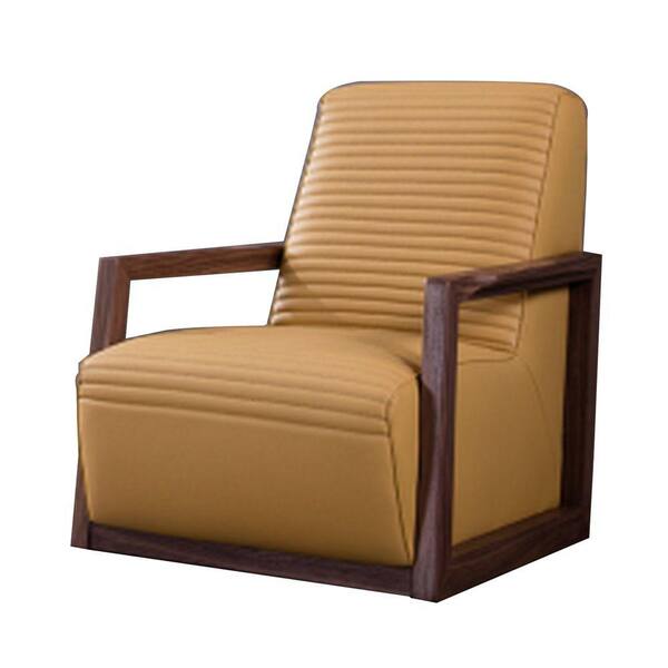 Yellow and Brown Leather Accent Chair with Wood Arms